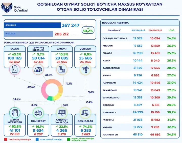 В пресс-службе Налогового комитета Республики Узбекистан сообщили, что по состоянию на 1 марта 2026 года количество субъектов, поставленных на специальный регистрационный учет в качестве плательщиков налога на добавленную стоимость, достигло 267 247. По сравнению с аналогичной датой прошлого года этот показатель увеличился на 30,2 процента, что свидетельствует о расширении налоговой базы и росте числа хозяйствующих субъектов, работающих в сегментах экономики с обязательствами по уплате НДС.