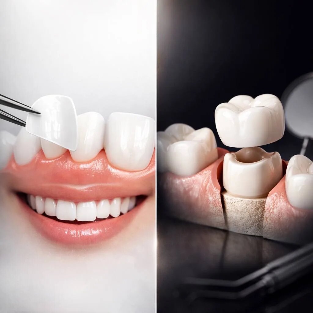 Многие пациенты часто думают, что виниры и коронки — это одно и то же. На самом деле это две разные реставрации, которые решают разные задачи. 🦷 Винир — это тонкая керамическая пластинка, которая фиксируется только на переднюю поверхность зуба. Он работает как эстетическая «обложка» для зуба. Виниры используют, когда нужно: — изменить форму зубов — выровнять линию улыбки — убрать щели — осветлить сильно потемневшие зубы — сделать улыбку более гармоничной При установке виниров снимается минимальный слой эмали обычно доли миллиметра. Зуб остаётся живым и максимально сохранённым. По сути, винир это самый бережный способ эстетически изменить улыбку. 🦷 Коронка — это уже полное покрытие зуба со всех сторон. Она надевается на зуб как «колпачок» и восстанавливает его, когда собственные ткани сильно разрушены. Коронки применяются, если: — зуб разрушен кариесом — была большая пломба — зуб после лечения каналов — есть трещины или сильный износ Для коронки зуб подготавливают более значительно, п