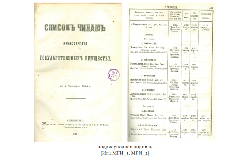 Ведомственные списки чинов существуют для многих (не всех) ведомств. Они содержат дополнительные сведения о людях, чаще всего — о должности, чине, вероисповедании, получаемом денежном содержании (как правило, подробно), прохождении службы (с какого года в ведомстве, в службе, в данной должности) и наградах (с датами награждения); не всегда — о семейном положении и полученном образовании (приводится название учебного заведения)294. Есть издания и с более широкой программой: например, по списку личного состава Министерства путей сообщения295 можно узнать также о вероисповедании жены, числе сыновей и дочерей, месте жительства, годе рождения, сословном происхождении, годе окончания учебного заведения или получения ученой степени; более точно — о прохождении службы (с какой даты в службе, в ведомстве, в должности, в чине); о последней полученной награде (с датой награждения).