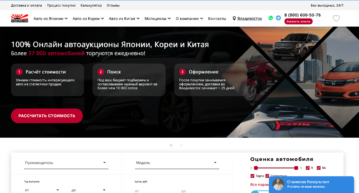 Компания начала с Японии, но давно и успешно работает с Кореей и Китаем. Минимальный срок доставки — от 14-ти дней. Предлагают как новые, так и подержанные авто.