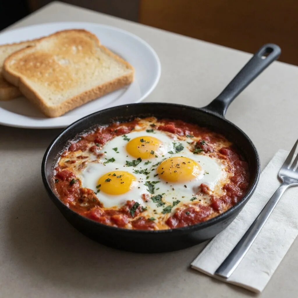 Знаменитое блюдо ближневосточной кухни. Готовится быстро и легко, а результат получается невероятно вкусным! Яйца куриные — 3 шт. Томатная паста (или свежие помидоры) — 300 г Лук репчатый — 1 средняя луковица Чеснок — 2 зубчика Болгарский перец красный — 1 шт. Оливковое масло — 4 ст.л. Соль, свежемолотый чёрный перец — по вкусу Паприка сладкая молотая — ½ ч.л. Кайенский перец (по желанию) — щепотка Свежая зелень петрушки или кинзы — небольшой пучок Мелко порубите лук и чеснок ножом. Перец очистите от семян и перегородок, после чего мелко нарежьте кубиками. Разогрейте оливковое масло в глубокой сковороде небольшого размера на среднем огне. Добавьте нарезанный лук и обжаривайте до мягкости около 5 минут. Затем добавьте измельчённый чеснок и жарьте ещё минуту-две, пока аромат не станет интенсивнее. Добавьте нарезанный болгарский перец и готовьте пару минут, помешивая. Выложите томатную пасту либо очищенные и порезанные кубиком свежие помидоры. Перемешайте всё вместе, посолите, поперчите и
