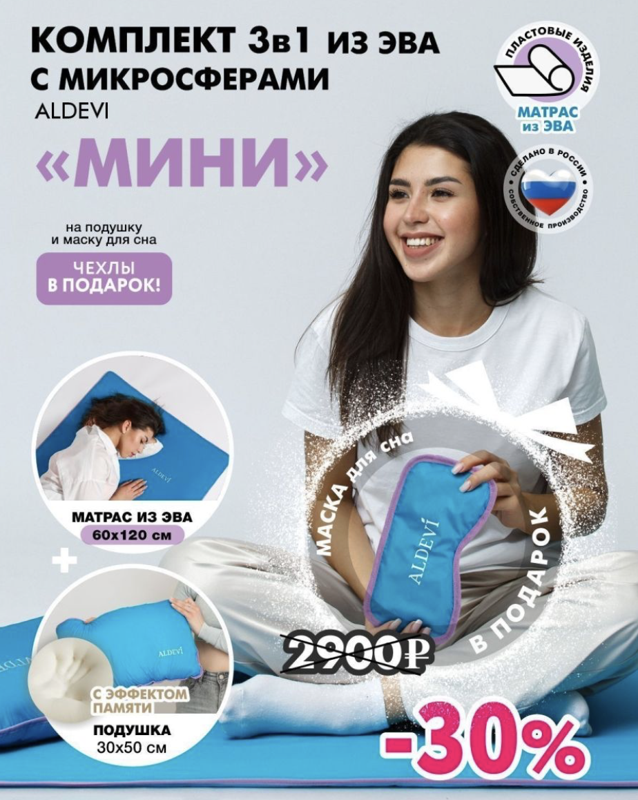 Чувствуете усталость, разбитость и постоянное напряжение? Мечтаете о быстром восстановлении после тренировок, снятии боли и просто глубоком, расслабляющем сне? Тогда вам пора познакомиться с комплексом "ALDEVI 3 в 1" – инновационным Комплекс представлен в четырех вариантах, чтобы вы могли выбрать оптимальный размер и функциональность: Мини (60х120 см): Мини-матрас + подушка 30х50 + маска для сна. Идеально для путешествий, пикников или для тех, кто хочет попробовать технологию ALDEVI. Стандарт (80х190 см): Матрас + подушка 30х50 + маска для сна. Оптимальный выбор для ежедневного использования. Комфорт (120х190 см): Матрас + подушка 40х60 + маска для сна. Больше пространства для комфортного отдыха и восстановления. Макси (160х190 см): Матрас + 2 подушки 40х60 + 2 маски для сна. Идеально для пар, ценящих комфорт и здоровый сон. В чем же секрет эффективности комплекса ALDEVI? Все дело в уникальном сочетании материалов: Не откладывайте заботу о своем здоровье на потом! Закажите комплекс "