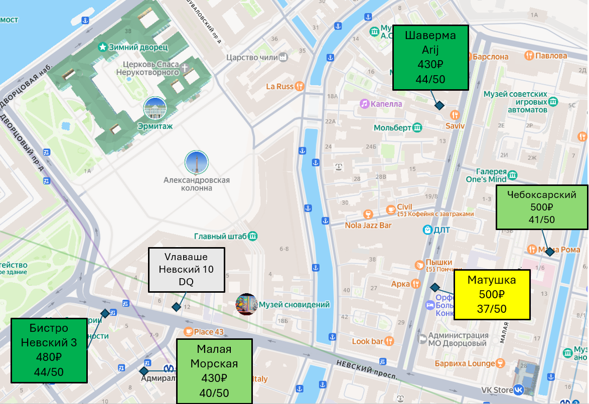 При равенстве баллов с Невском 3 не первая рекомендация, потому что чуть дальше идти. Через дворы Капеллы выходите на Большую Конюшенную, поворот налево и вторая арка (в первой только гирос, а это уже не то). Для облегчения поисков есть небольшая вывеска рядом с аркой.