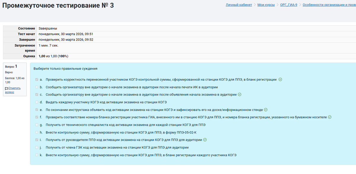 Промежуточное тестирование № 3 Выберите только правильные суждения Вопрос 1 a. Проверить соответствие номера бланка регистрации участника ГИА, внесенного им в станцию КОГЭ для ППЭ, и номера бланка регистрации, указанного на бумажном носителе b. Сообщить организатору вне аудитории о начале экзамена в аудитории после объявления начала экзамена в аудитории c. По окончании инструктажа объявить код активации экзамена на станции КОГЭ и зафиксировать его на доске/информационном стенде d. Получить от технического специалиста код активации экзамена для каждой станции КОГЭ для ППЭ e. Сообщить организатору вне аудитории о начале экзамена в аудитории после начала печати ИК в аудитории f. Внести контрольную сумму, сформированную на станции КОГЭ для ППЭ, в бланк регистрации каждого участника КОГЭ g. Получить от члена ГЭК код активации экзамена на станции КОГЭ для ППЭ для аудитории h. Получить от руководителя ППЭ код активации экзамена на станции КОГЭ для ППЭ для аудитории i. Проверить корректность