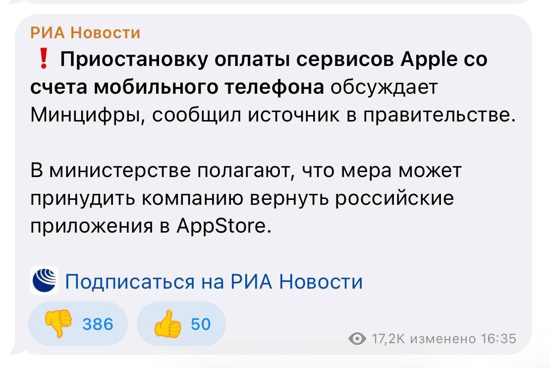 ⚡️В России хотят ограничить оплату в App Store с помощью счёта мобильного телефона с помощью этого власти хотят заставить Apple вернуть