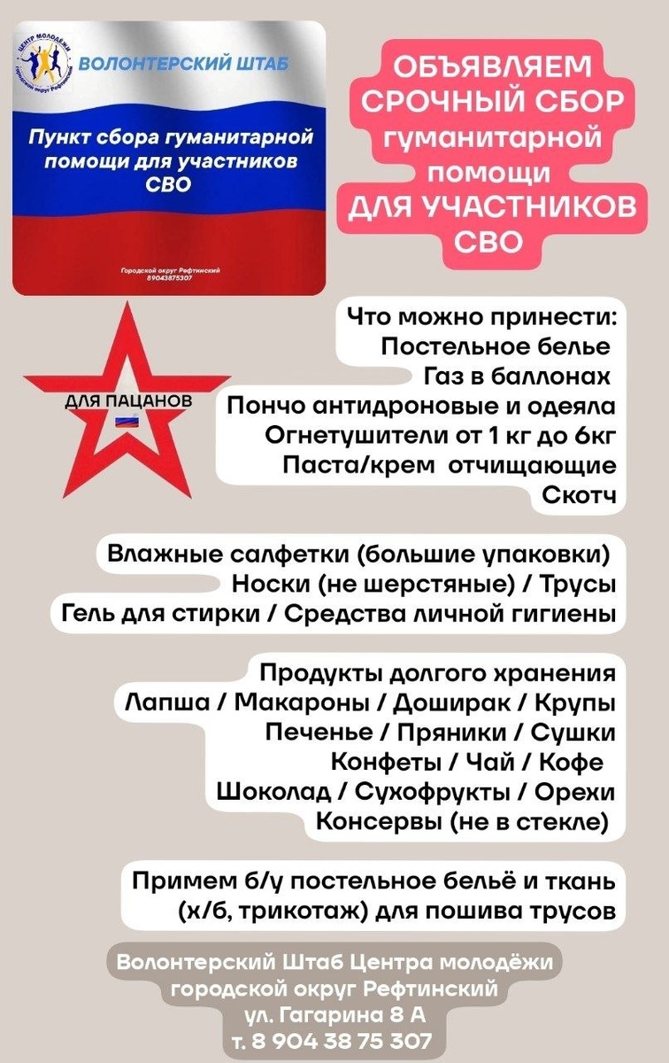🇷🇺 ОБЪЯВЛЯЕМ ‼️ СРОЧНЫЙ СБОР‼️ ГУМАНИТАРНОЙ ПОМОЩИ ДЛЯ НАШИХ ЗЕМЛЯКОВ - УЧАСТНИКОВ СВО 🇷🇺Что можно принести:🇷🇺 Постельное белье Газ в баллонах Пончо антидроновые и одеяла Огнетушители от 1 кг до 6кг Паста / крем отчищающие Скотч Влажные салфетки (большие упаковки) Носки (не шерстяные) / Трусы Гель для стирки / Средства личной гигиены Продукты долгого хранения Лапша / Макароны / Доширак / Крупы Печенье / Пряники / Сушки Конфеты / Чай / Кофе Шоколад / Сухофрукты / Орехи Консервы (не в стекле) ‼️‼️Примем б/у постельное бельё и ткань (х/б, трикотаж) для пошива трусов‼️‼️ Благодарим каждого, кто готов внести свой посильный вклад в общее доброе дело и надеемся на ваще активное участие направленное на помощь участникам СВО. 🔥 Репост поста - тоже помошь 🔥 Готовы присоединиться к волонтерам - звоните т. 89043875307 Елена Евлентьева Принести гуманитарную помощь для участников СВО можно в будние дни с 10.00 до 18.00 в Волонтерский Штаб, го Рефтинский, ул. Гагарина 8 А, или в Це