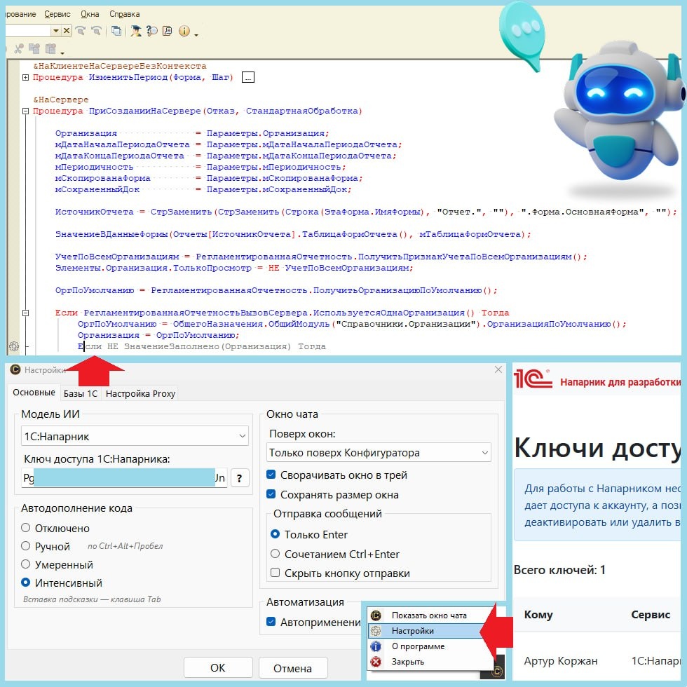 Последнюю неделю тестирую Confaster. Это молодой ИИ‑агент, который работает внутри Конфигуратора. Встроенный MCP‑сервер, автодополнение, ревью кода, исправление ошибок, доработка методов - всё без переключения окон и без внешних костылей. Пока продукт бесплатный, но именной домен и автоматические обновления намекают, что в будущем агент может стать платным (надеюсь, ошибаюсь). Инструмент действительно стоящий. ▪️ Установка занимает меньше 10 минут. Без долгих настроек контекста, MCP‑серверов, ручного подключения агентов, копирования промптов и пр. ▪️ Интерфейс минималистичный. На полях кода появляется маленькая шестерёнка: в ней пять полезных режимов. ▪️ Модель 1С:Напарник не галлюцинирует. По крайней мере на моих задачах откровенную ерунду не выдавало. Иногда промахивается в логике, но в целом помогает. По контексту подсвечивало варианты кода аккуратно. Подстановка работает по Tab. Ощущение, что в конфигураторе снова появился Снегопат, только современный и умный. Старшие товарищи по