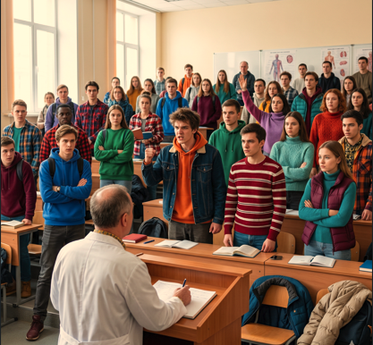 — Здравствуйте, будущие коллеги! — он окинул нас хозяйским взглядом и небрежно бросил журнал на стол. — Сегодня у нас объемная тема. Но для начала проверим ваши знания. Наденька, прошу к доске. Расскажите нам ход сложной операции.