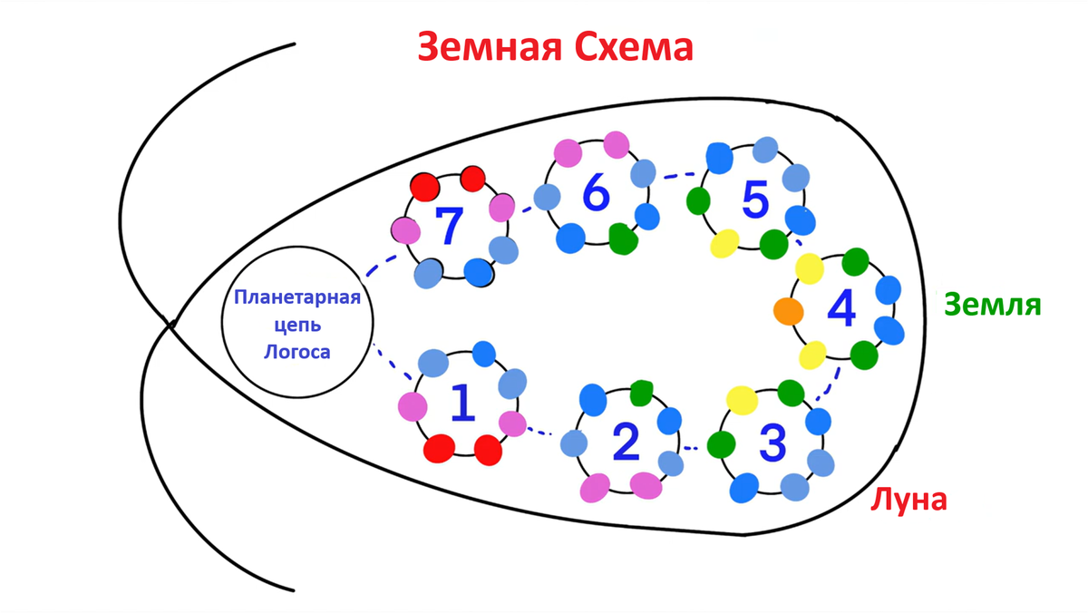 Диаграмма иллюстрирует схему эволюции Земли. Показаны семь цепей, в каждой из которых по семь глобусов. Не показано напрямую, что каждый глобус проходит семь кругов развития. Стоит отметить, что хотя в схеме 49 глобусов, обычно одновременно существует не более одного набора из семи глобусов. Исключение составляют «трупы», такие как наша Луна, которые не полностью распались. Здесь возникает проблема. Если в каждой цепи есть свой 4-й глобус на самом низком уровне материи, то, согласно этой аналогии, лунная цепь должна иметь эфирный глобус в качестве своего низшего проявления. И всё же мы имеем дело с Луной, которая явно физическая. Означает ли это, что Ледбитер был прав с самого начала, и в нашей Солнечной системе есть ещё два видимых глобуса, Меркурий и Марс, которые на самом деле являются частью земной цепи? Честно говоря, я не знаю. Это вызвало немало споров. Ситуация ещё больше запутывается, когда Ледбитер описывает семь цепей Солнечной системы и помещает Землю в эту группу. Земля ещё не является главной планетой (принципом), поэтому она не принадлежит к этой избранной группе. С большей уверенностью можно сказать, что то, что мы сейчас называем Луной, – это лишь остаток гораздо большего по размерам глобуса, который был физической планетой третьей цепи, занимая в третьей цепи то же положение, что и Земля в четвёртой. В седьмом круге земной цепи Луна полностью распадётся, так что Земля останется без спутника.