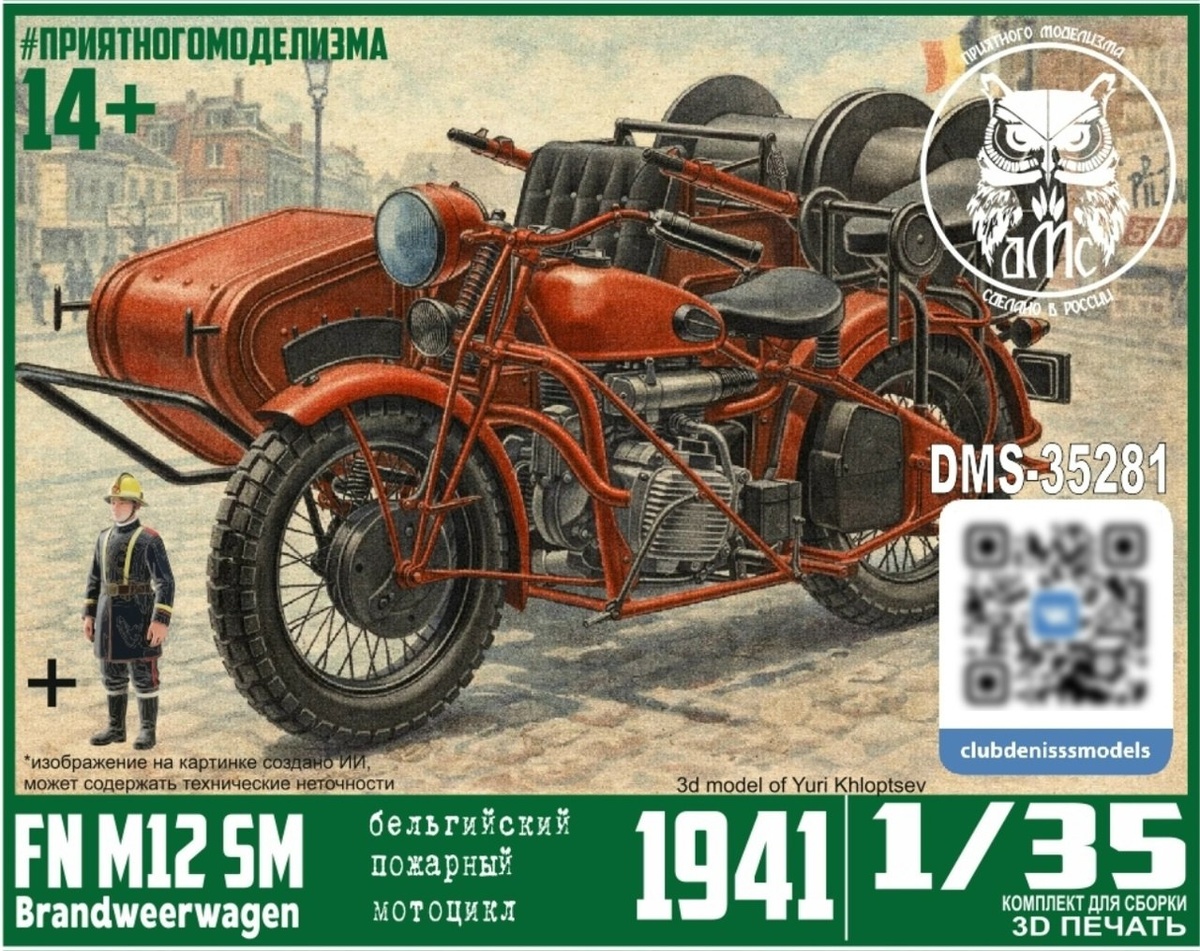 Кировская ДМС (denisssmodels) выпустила на 3D-принтере модель бельгийского пожарного мотоцикла FN M12SM в масштабе 1/35:
