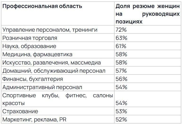 В какой сфере больше всего?👩🦰 Большинство резюме на управленческие позиции в сфере HR подают женщины. Они составляют 72% всех топ-менеджеров в этой области. В пятерку сфер, где женщины занимают лидирующие позиции или стремятся к ним, входят: ⏺️розничная торговля — 65% ⏺️наука и образование — 61% ⏺️медицина и фармацевтика — 58% ⏺️искусство, развлечения и медиа — 58% Разница в зарплатных ожиданиях остается значительной. Женщины-руководители отмечают доход на 24% ниже, чем мужчины. В среднем это составляет 118 900 ₽ против 156 400 ₽ у их коллег мужского пола. В ряде сфер разрыв ещё сильнее: ⏺️медицина и фармацевтика — –44% ⏺️рабочий персонал — –36% ⏺️наука и образование — –35% Интересненько получается! Женщины занимают руководящие позиции в разных отраслях, но часто недооценивают свою работу. Это не просто вопрос представленности, а проблема переговорной силы и внутренних ориентиров на рынке труда. Что думаете, коллеги?