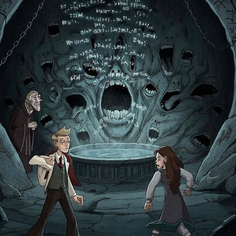 Они спустились глубоко под замок с палочками наготове. Чем ниже становились ступени, тем тише делался воздух. Не в смысле «беззвучнее» — именно тише, будто кто-то убирал из мира саму способность звуков существовать. Даже шаги звучали глухо и странно, словно их кто-то ел прямо на лету.