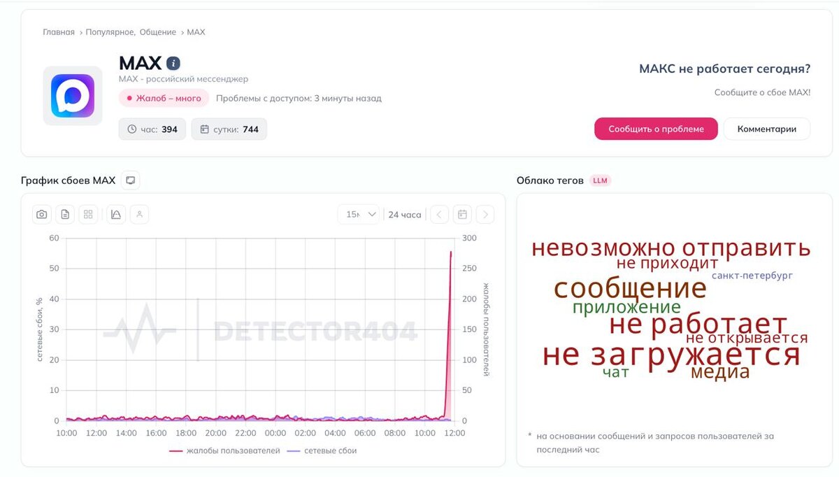 По данным сервисов по отслеживанию сбоев, за последние сутки поступило более 700 жалоб и почти 400 за последний час. Пользователи сталкиваются с проблемами при отправке и получении сообщений или загрузке медиафайлов. ТВК