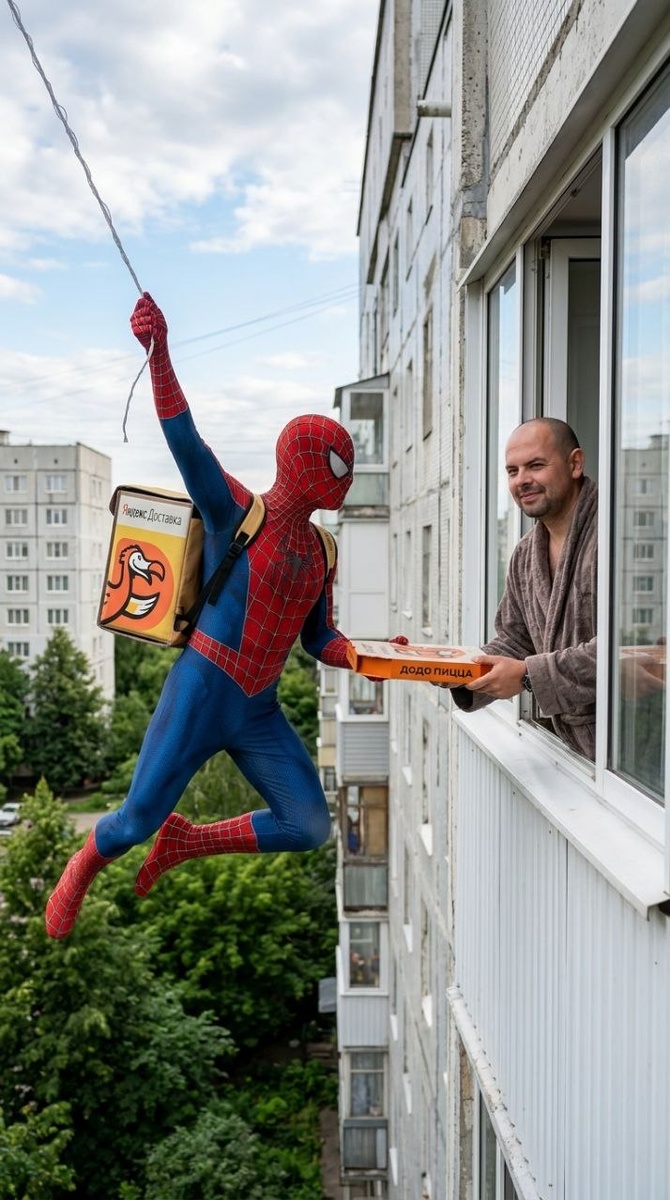 От подписчика @SnowdenBrend Вертикальная картинка на которой изображены Я сохрани мои черты лица в точности с загруженнной фото и Человек паук в классической одежде. Локация: Летние панельные дома, атмосфера россий. Небо с редкими тучами и солнцем. Дневное омвещение. Сюжет: Я стою у открытого окна в квартире одетый в домашний халат, ко мне подлетает держась одной рукой за паутину Человек паук с коробкой на спине "Яндекс Доставка", а второй рукой протягиваем мне коробку пиццы от фирмы (До до пицца). У меня скромная и сдержанная улыбка держась за коробку, которую передает мне Человек паук. Высокая детализация текстур локаций и одежды человека паука. Персонажи должны быть легко узнаваемы. Сгенерировать без лишних мучений можно в веб агрегаторе нейросетей gptunnel(промокод на скидку 75% PROMPT1_75 ) или телеграм боте Syntx Еще у нас есть группа VK и сайт-каталог промптов https://prompt1.ru/ #смешные@prompt1_ru