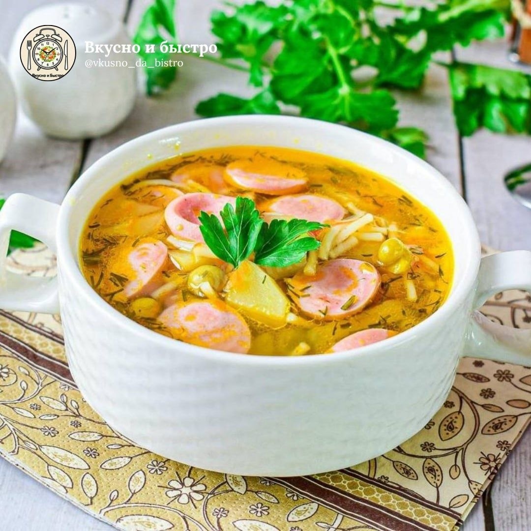 #обед #суп #30мин 🕒 Время приготовления 30 мин Порции 4-5 Сложность: легко 🧾 Ингредиенты: 🟠Сосиски — 6 шт. 🟠Картофель — 4 шт. 🟠Морковь — 1 шт. 🟠Капуста — 200 г 🟠Вода или бульон — 1400 мл 🟠Соль, перец, зелень — по вкусу 🍴Приготовление: 1. Картофель и сосиски нарежьте небольшими кусочками. Морковь натрите на крупной тёрке, капусту нашинкуйте. 2. В кастрюле доведите до кипения воду или бульон. Добавьте картофель и морковь, варите 10 минут. 3. Добавьте капусту и готовьте ещё 5–7 минут на среднем огне. 4. Положите сосиски и варите ещё 5 минут. 5. В конце посолите, поперчите, добавьте свежую зелень и снимите с огня. Вкусно и Быстро | Мы в Мах 📲