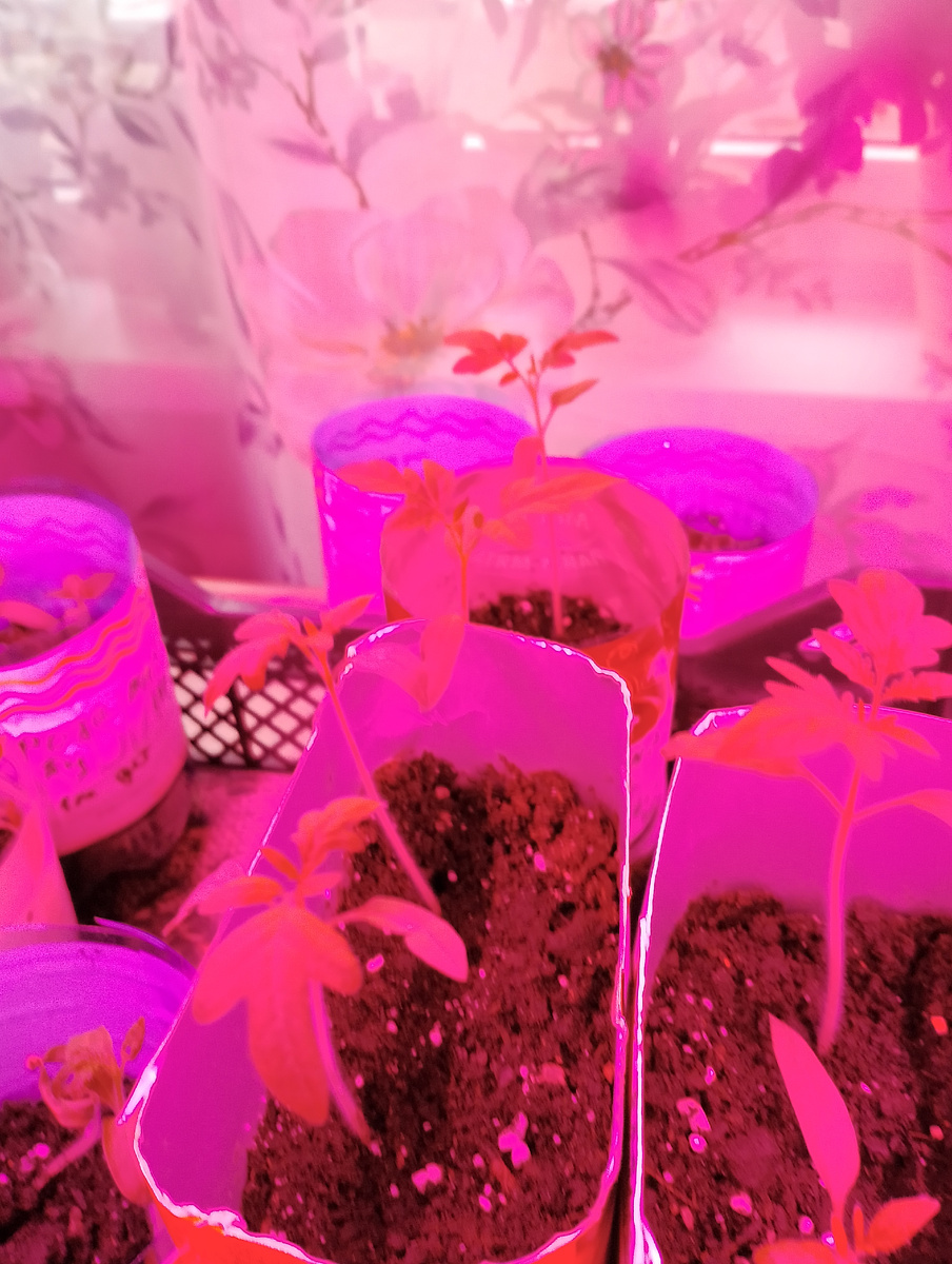 Перед поездкой в санаторий посадила семечки помидор. Каждый горшочек подписала. Семечки сажала сухие и по две штучки. Я вообще всегда проращиваю семена, а тут некогда было. Рассаду поручила супругу. Велено было опрыскивать и по столовой ложке давать воды каждому горшочку через день. Через неделю сообщил, что почти все вылезли и растут. Велено было включать лампу досвечивания. В комнате, где стоит рассада, окна выходят на восток. Поэтому там не очень светло.