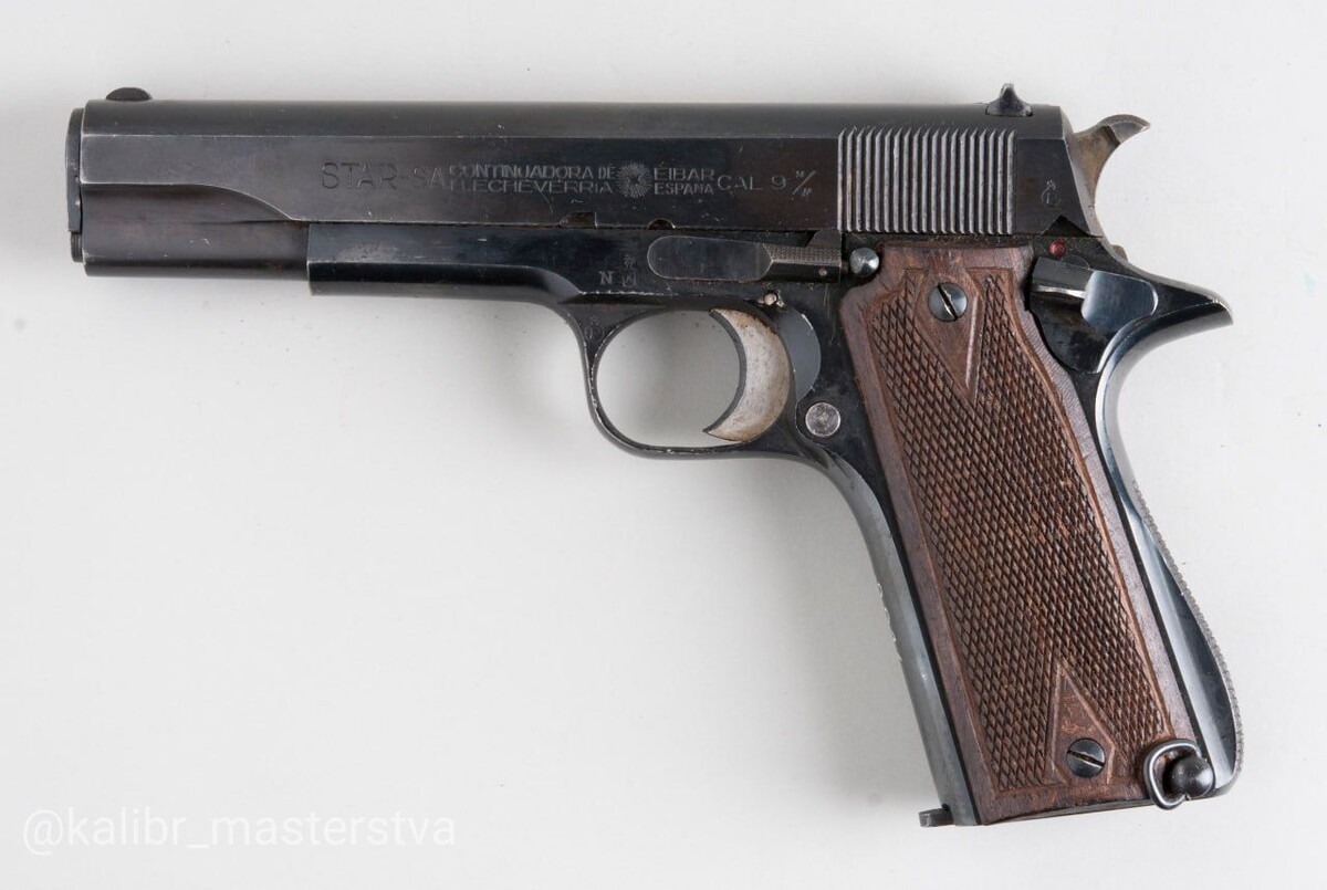 🇪🇸 Star Model B — полуавтоматический пистолет испанской компании Star Bonifacio Echeverria, разработанный в 1920-х годах. Внешне напоминает Colt M1911, но отличается конструкцией и использованием патрона 9×19 мм Parabellum. Широко применялся во время Второй мировой войны и экспортировался во многие страны. ✅ ТТХ: Калибр: 9×19 мм Parabellum Принцип действия: короткий ход ствола, запирание перекосом Магазин: 8 патронов Длина ствола: ~127 мм Общая длина: ~215 мм Вес: ~1.1 кг Материалы: сталь, щёчки рукояти из дерева или пластика Особенности: внешнее сходство с Colt 1911, но без автоматического предохранителя на рукояти 🔍 Интересные факты: - Выпускался с 1926 по 1983 год в различных вариантах. - Использовался армией Испании и поставлялся в Германию во время Второй мировой войны. - Один из самых известных испанских пистолетов XX века. #Star #Пистолет #ИсторияОружия Калибр Мастерства - Всё об Огнестрельном Оружии