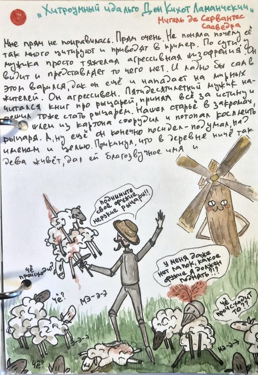 Мне прям не понравилась. Прям очень. Не поняла почему её так много цитируют и приводят в пример. По сути, у мужика просто тяжелая агрессивная шизофрения. Он видит и представляет то чего нет. И ладно бы сам в этом варился, дак он ещё и нападает на мирных жителей. Он агрессивен. Пятидесятилетний мужик начитался книг про рыцарей, принял всё за истину и решил тоже стать рыцарем. Нашел старьё в закромах, шлем из картона соорудил и потопал косплеить рыцаря. А, ну ещё он конечно посидел — подумал, над именем и целью. Прикинул, что в деревне ничё так дева живёт, дал ей благозвучное имя и обрёк быть его дамой сердца. Тут же принял таверну за замок и в первую же ночь убил ни в чём не повинного мужика, который просто хотел напоить лошадей, ну вот ему просто приглючилось, что это злодей его доспехи стырить захотел. И всем норм, все ха-ха, да ладно, да ща разберёмся, вы же видите, что он не в себе. Домашние его тоже стараются, сожгли его библиотеку (дабы деда подпустило), но сказали при этом, что в