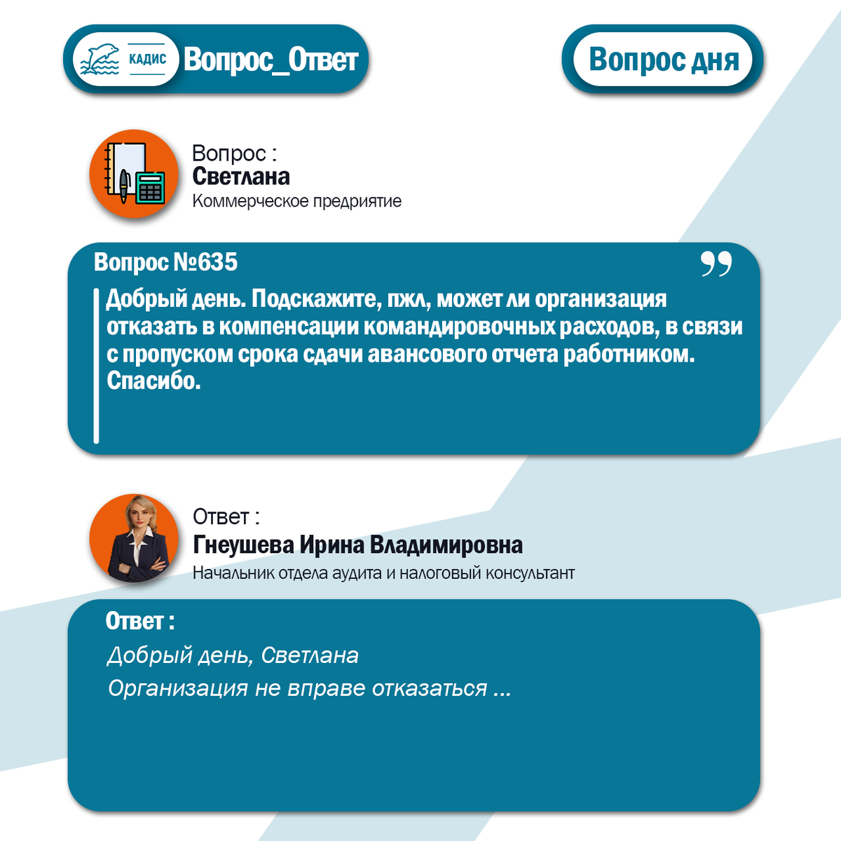 Добрый день. Подскажите, пжл, может ли организация отказать в компенсации командировочных расходов, в связи с пропуском срока сдачи авансового отчета работником. Спасибо. Ответ: Добрый день, Светлана Организация не вправе отказаться компенсировать расходы командированного работника из-за того, что пропущен срок сдачи авансового отчета. В соответствии с частью 1 статьи 168 ТК РФ существует обязанность компании возмещать командированным работникам расходы, связанные с командировкой на: - проезд; - аренду жилья, - проживание вне места постоянного жительства (суточные); - иные цели, при условии, что расходы были согласованы с работодателем. В соответствии с п. 23 Положения об особенностях направления работников в служебные командировки, утв. Постановлением Правительства РФ от 16.04.2025 № 501, работник по возвращении из командировки обязан в течение 3 рабочих дней представить бухгалтеру авансовый отчет об израсходованных в связи с командировкой суммах. На основании этого отчета производитс