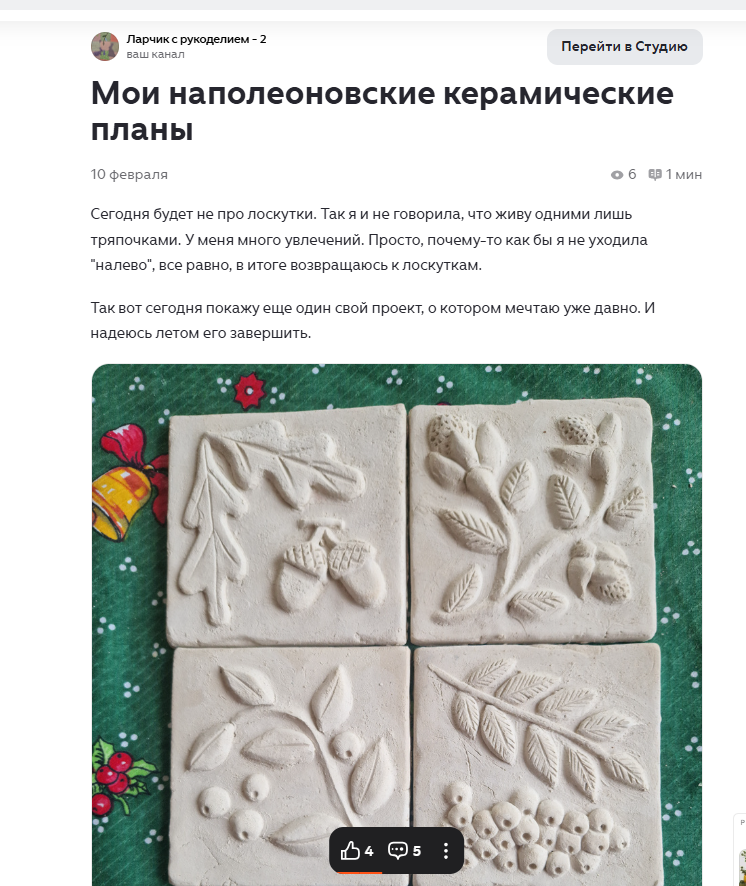 Я уже писала о своих грандиозных планах на декор своей любимой дачи. Увы, ссылка на статью, почему-то не загружается. Поэтому, даю только скрин. И вот сегодня, ЙО-ХО, первые четыре плиточки уже готовы! Мои первые плиточки! совершенно самостоятельные ОТ и ДО! С фоном нужно еще поработать. Белый мне не очень нравится. Наверняка, специалист найдет в них кучу ошибок, недочетов. Но, я не профи, я - дилетант, и поэтому радость моя совершенно дилетантская, а следовательно - безмерна. Проект, на который я замахнулась, очень грандиозный. И не для новичка. Но, мы легких путей не ищем. У нас - размахнись рука, раззудись плечо! даешь сразу СТО (!), а то и СТО ДВАДЦАТЬ (!) плиточек. А что делать? Мне именно столько нужно для задумки. Потому что, когда их много, и они вместе, это очень красиво смотрится (я Щитаю). А у нас на доме есть уголок, который прямо таки просится на это оформление. Да прибудет со мной Сила и Терпение довести задумку до конца.