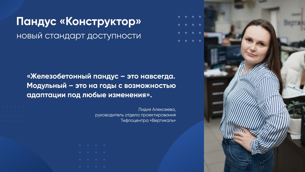 Как избежать этих рисков и установить конструкцию, которая гарантированно соответствует ГОСТ Р 51261-2022 и СП 59.13330.2020, но при этом не требует капитальных работ и разрешений на строительство? В интервью с главой отдела проектирования Тифлоцентра «Вертикаль» Лидией Алексеевой разбираем преимущества модульного пандуса «Конструктор» – современного решения для социальных объектов любого типа.