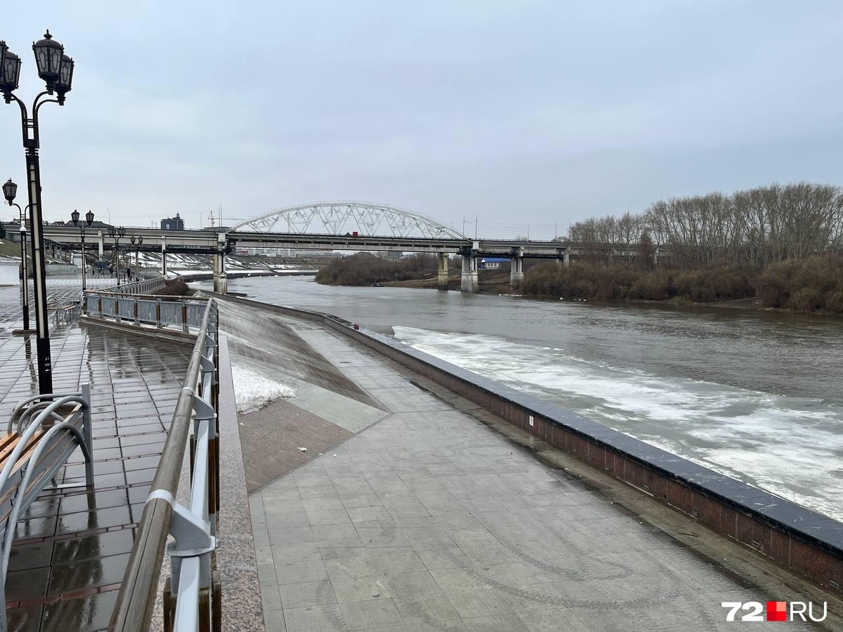 Сейчас судить о наполнении реки сложно — на поверхности еще даже не полностью растаял лед, хотя река уже вскрылась. Давайте вместе посмотрим, что происходит на набережной в конце марта — после первых оттепелей. Вот как выглядит берег реки в районе «Конторы пароходства». 💬 По опорам моста видно, что уровень Туры незначительно поднялся, но часть дна под опорой так и не ушла под воду. Будем надеяться, что в период сезонного половодья русло наполнится. Кстати, сейчас нижний ярус закрыт для посещения, поэтому спуститься ближе к реке не получится.