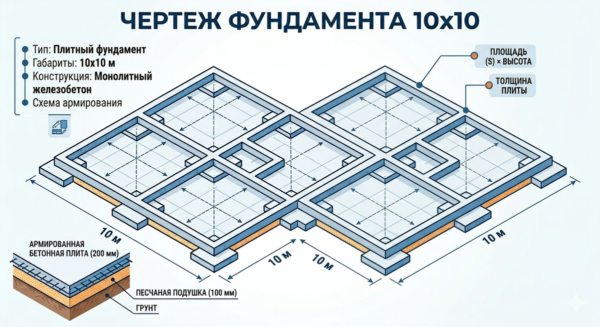 Расчет объема бетона для фундамента 10х10: формулы и примеры для разных типов оснований