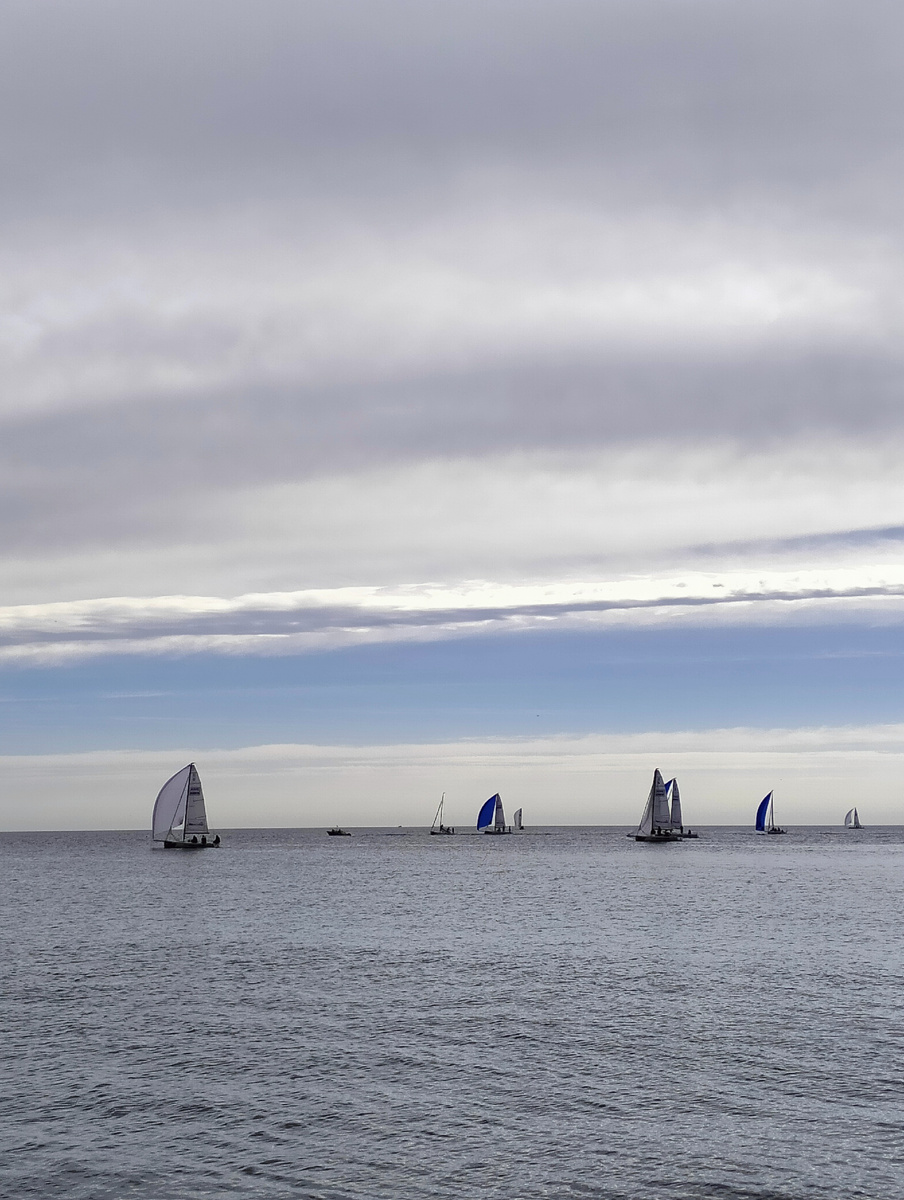 Смотрю на горизонт, и время будто остановилось. Главным событием этого дня стал парад парусников. Видимо, у них были соревнования по парусному спорту — белые и голубые паруса сновали по водной глади, словно большие крылья чаек. Это было настолько красиво, что невозможно было отвести взгляд. Казалось, я смотрю не на спортивное мероприятие, а на старинную картину или сцену из фильма.