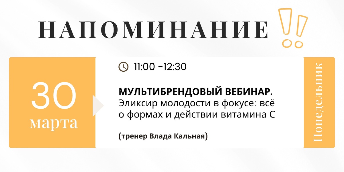☀️ Уже через 30 минут мы встречаемся с вами в онлайн-формате на мультибрендовом вебинаре 🎙 Тема вебинара: «Эликсир молодости в фокусе: всё о формах и действии витамина С» Ссылка для подключения ➡️ перейти
