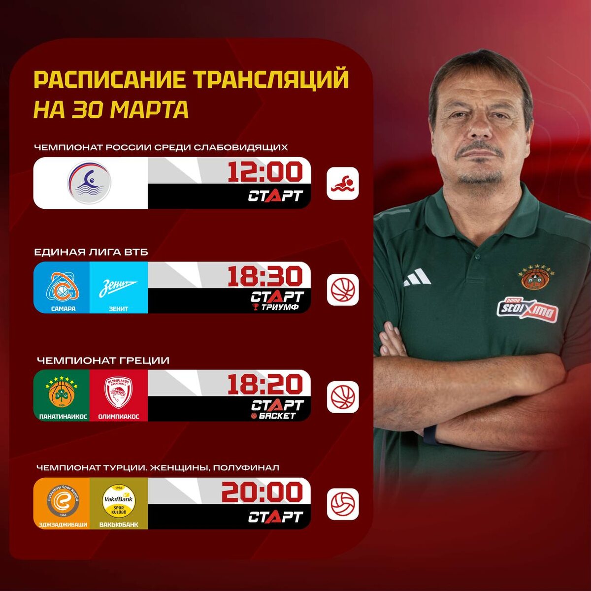 ! Сегодня смотрим плавание, баскетбол и волейбол. Насыщенная программа для понедельника! Особенное внимание уделим Греции, ведь в 18:20 соберемся в студии на телеканале «Старт Баскет», где обсудим предстоящий матч с классным гостем — тренером ПБК ЦСКА Яннисом Гапкиадисом 🙌🏻 Подписывайся на ТВ СТАРТ в MAX📲