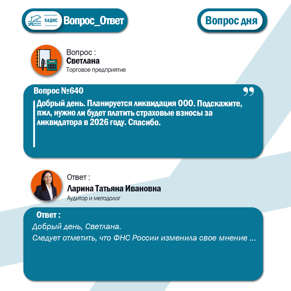 Добрый день. Планируется ликвидация ООО. Подскажите, пжл, нужно ли будет платить страховые взносы за ликвидатора в 2026 году. Спасибо. Ответ: Добрый день, Светлана. Следует отметить, что ФНС России изменила свое мнение, ранее изложенное в ТГ-канале «Чат ФНС России», в отношении обязанности исчислять обязательные минимальные страховые взносы на ликвидатора организации. Вопрос в части применения положений статьи 137 ФЗ от 28.11.2025 № 425-ФЗ в отношении ликвидатора проработан ФНС России. Позиция, согласованная с Минфином России, изложена в Письме ФНС России от 18.03.2026 г. № БС-36-11/2025@. Учредители (участники) юридического лица или орган, принявшие решение о ликвидации юридического лица, назначают ликвидационную комиссию (ликвидатора) и устанавливают порядок и сроки ликвидации в соответствии с законом (пункт 3 статьи 62 ГК РФ). С момента назначения ликвидационной комиссии к ней переходят полномочия по управлению делами юридического лица (пункт 4 статьи 62 ГК РФ). Учитывая изложенное,