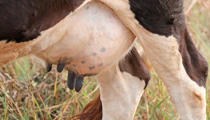 - вымя выглядит бугристым;