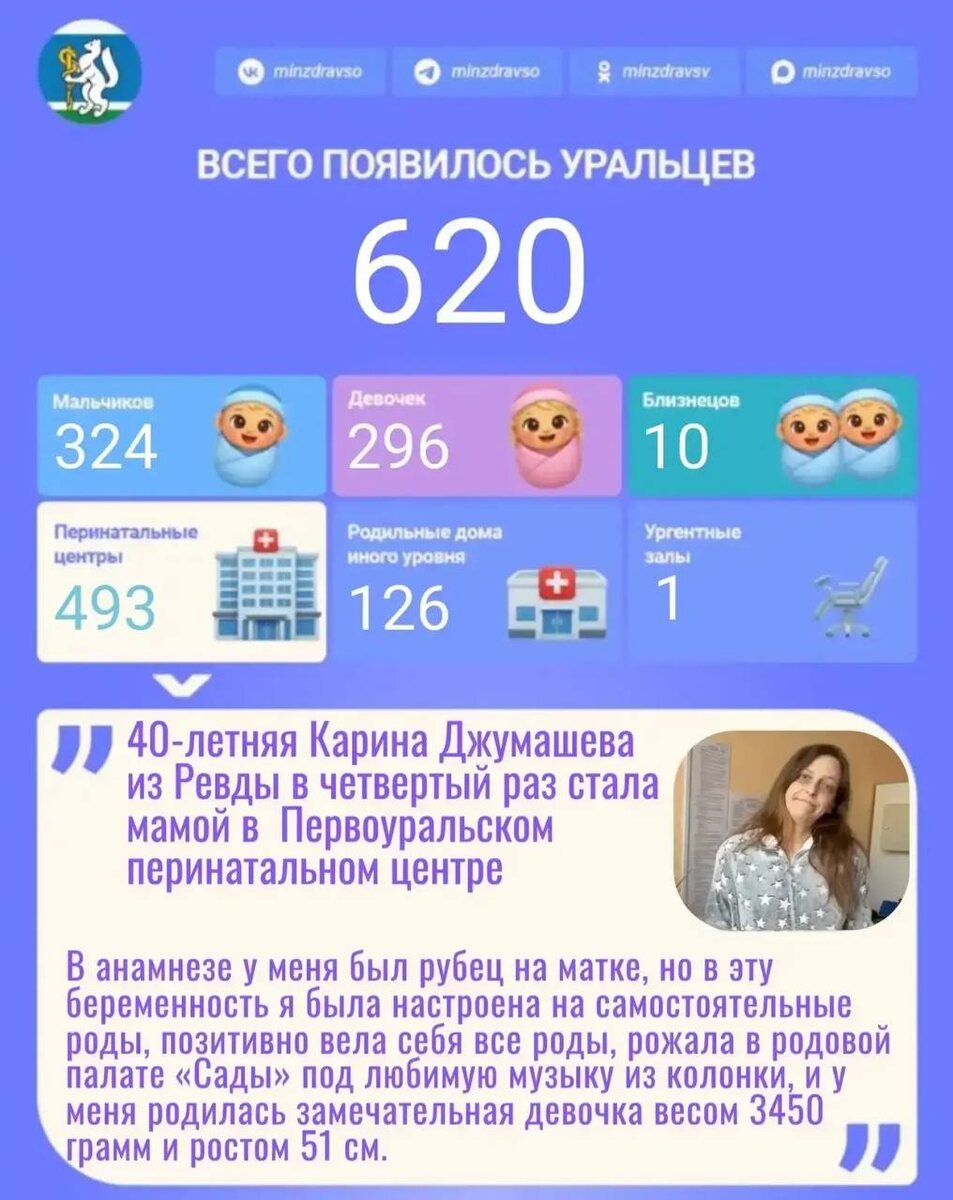 : 324 мальчика и 296 девочек, из них 5 пар близнецов! 398 родов наши медики приняли в перинатальных центрах Екатеринбурга. 95 родов прошли в межмуниципальных центрах. Читай новости Берёзовского в ВК | МАХ
