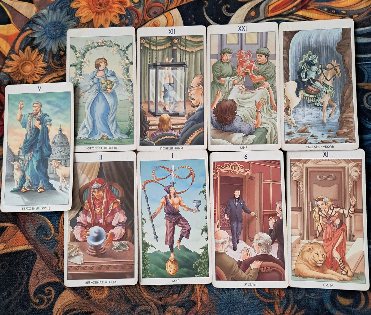 Это очень интересный и мощный расклад. Карт много, но они складываются в четкую историю. «78 дверей» — колода глубокая, и вытянутые арканы показывают, что ситуация для вас крайне важна, замешаны не только внешние обстоятельства, но и глубокие внутренние процессы.