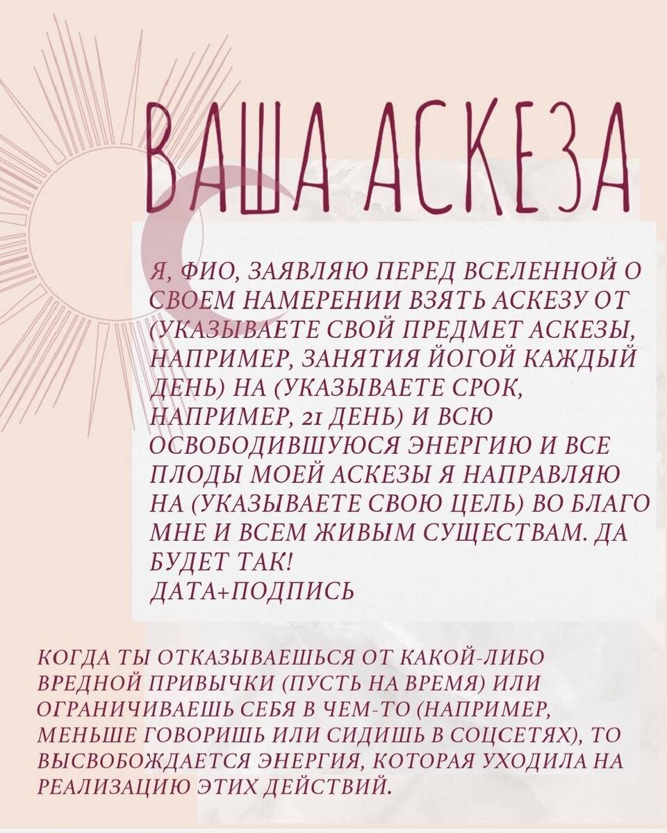 ! 🌟 Аскеза — это не наказание, а мощный инструмент для внутреннего роста и трансформации. Это возможность укрепить волю, очистить ум и направить свою энергию на то, что действительно имеет значение для тебя. Почему именно СЕЙЧАС? 1 и 2 апреля — это особенные дни, когда дисциплина и выдержка находятся на пике. Если ты давно чувствуешь, что пора изменить что-то в себе, выйти на новый уровень и перестать откладывать важные дела, то это идеальный момент для начала. ✨ Секрет успешной аскезы Лучше всего работает аскеза, посвященная чему-то большему, чем просто собственные желания. Когда ты направляешь свои усилия на: • Служение другим • Очищение своей жизни • Благо близких • Приближение к Богу • Создание более чистой и зрелой жизни В этот момент аскеза превращается в нечто волшебное. Все самое лучшее начинается после аскезы! Что ты можешь выбрать? • Отказ от сладкого, кофе или мучного • Вегетарианская диета • Ранние подъемы • Занятия йогой каждый день • Прием холодного душа с утра • Е