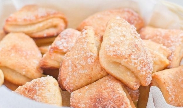 7. В последний раз окуните одну сторону треугольника в сахар и выложите на противень, застеленный пергаментной бумагой, сахарной стороной вверх.