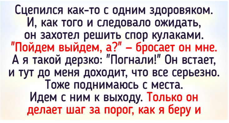- Сцепился как-то с одним здоровяком. И, как того и следовало ожидать, он захотел решить спор кулаками. «Пойдем выйдем, а?» — бросает он мне. А я такой дерзко: «Погнали!» Он встает, и тут до меня доходит, что все серьезно. Тоже поднимаюсь с места. Идем с ним к выходу. Только он делает шаг за порог, как я беру и тут же закрываю за ним дверь и запираю ее. К своему столику возвращаюсь как герой под одобрительный смех окружающих. © Евгений Проклов