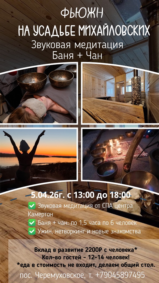 Звуковая медитация (бубны, чаши + баня + чан) Начало: 05 апреля 2026 13:00 Окончание: 05 апреля 2026 18:00 Стоимость: 2200.0 руб. Адрес: г Омск, ул Катышева, д 9А Организатор: Усадьба Михайловских Фьюжн на Усадьбе Михайловских! Звуковая медитация! 5 апреля 2026 | с 13:00 до 12:00 - 11 мест По вопросам пишите в личку ТГ @Ekaterina_Zemlyanaya 💕Приглашаем вас на особенный день глубокого отдыха и восстановления. Это возможность замедлиться, отключиться от суеты и подарить себе целостную практику для тела и души. В программе дня: 🔥 Банный комплекс: Настоящая баня на дровах, наполненная ароматом целебных трав, и уютный чан с шикарным видом на Иртыш, украшенный цитрусом и хвоей. 🧘♀️ Звукотерапия: Сеанс «Чары звука и вибраций» от Алексея и Анны. Погружение в звучание поющих чаш, шум моря, ханг, колокольчики и... #тело_баня_/_сауна Узнать подробности, адрес или записаться на событие.