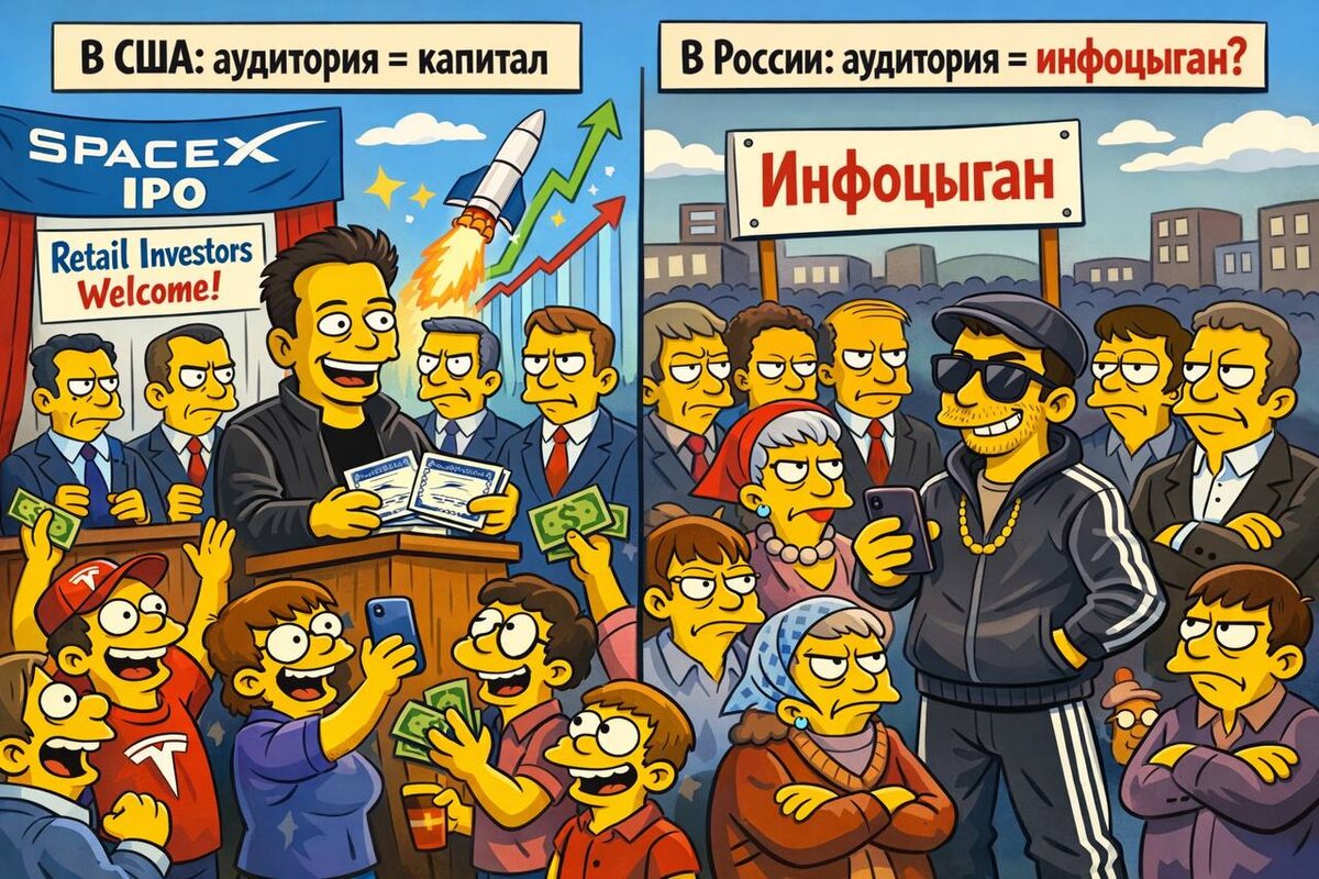 И делает ход, который ломает правила. До 30% акций могут отдать розничным инвесторам (частные люди). Обычно дают 5-10%. Зачем? Он продаёт не акции. Он продаёт веру. Его расчёт: частник держит дольше, чем фонд. Фонд - это цифры (зашёл, заработал, вышел). Аудитория - это лояльность (доверие, эмоция, долгий горизонт). Он уже это делал с Tesla и именно поэтому их акции стоят дороже всего автопрома в мире вместе взятого. Люди не просто покупали акции. Они покупали участие в истории. В США соцсети - это актив. Если у тебя нет аудитории, ты слабый. Я слышал кейс: фонд отказал стартапу со словами: «у вас нет аудитории - вы не умеете продавать» В России всё наоборот. Если у тебя есть аудитория - ты «инфоцыган» Логика кривая! Аудитория = дистрибуция (способ быстро донести продукт). Дистрибуция = деньги. Пример: у тебя 100k подписчиков ты запускаешь продукт 10% покупают по 100$ = 1 млн $ выручки без фондов