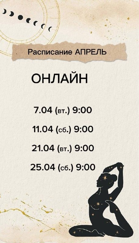 ! Все классы начинаются в 9:00, длительность - 1,5 часа. Как всегда, у вас остается ЗАПИСЬ и возможность практиковать в любое удобное время. Тема апреля - ВЕСЕННЕЕ ПРОБУЖДЕНИЕ! Женские практики, гормональный баланс, иммунитет и радость жизни! 🪴 Присоединиться к практикам в апреле - 3000 руб. Для записи на ОНЛАЙН классы пиши мне в ЛС! @AnnaNovikova30_87