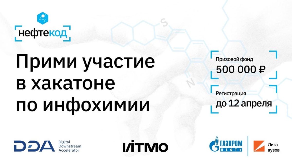 »! Весна — идеальное время прокачать свои навыки и попробовать себя в чем-то новом! Университет ИТМО, Акселератор цифровых инноваций и Лига Вузов ПАО «Газпром нефть» запускают Всероссийский хакатон «Нефтекод»! «Нефтекод» — это соревнование на стыке data science и химии, где вам предстоит создать алгоритм будущего в инфохимии. Ваша задача — разработать модель, которая сможет предсказывать показатели окислительного теста Даймлера для сложных рецептур масел на основе данных о компонентах и их молекулярной структуре. Что вас ждет: — Работа с реальными индустриальными данными — Поиск скрытых закономерностей между составом и свойствами — Выбор подхода к представлению молекул: от дескрипторов до графовых моделей — Разработка собственной архитектуры прогнозирования — Финальная защита в Санкт-Петербурге перед экспертами Призовой фонд хакатона — 500 000 рублей! Ключевые даты: Регистрация: до 12 апреля Онлайн-этап: 13–19 апреля Финал: 24 апреля (Санкт-Петербург) — очная встреча 10 лучших ком