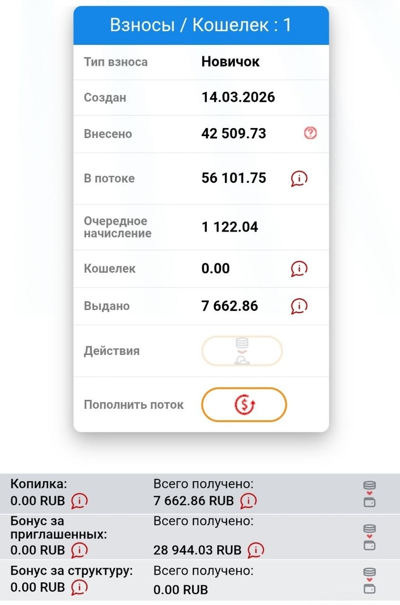 Вход, как я уже писала раньше, - от двух тысяч до двухсот тысяч рублей, можно начать с трёх, пяти, десяти тысяч, с любой удобной суммы, и каждое пополнение увеличивается на 50%. Пополняется поток в любое время и любое количество раз. 🔵 В моём потоке на данный момент 🔹во вкладке «Внесено» - 42 509р. 🔹а «В потоке» - 56 101 р, (моя внесённая сумма, умноженная на 50%) При начислении награды мне в кошелек каждый день капает определенная сумма: это 2% от вынесенной суммы. На данный момент это 1122р. И завтра у меня в кошельке будет уже больше 2тыс.р. Я добавлю к ним реферальные и обратно запущу в поток. ВОТ ТАКАЯ ВЕСЁЛАЯ АРИФМЕТИКА) Причём первое моё пополнение было всего 4 тысячи рублей, а остальная сумма - это партнёрские, и в графе «Бонус за приглашённых» у меня 28 944 р. Когда в графе "внесено" 200 тысяч р., в потоке сразу станет 300 тысяч, и каждодневное начисление будет 6 тысяч р, 👉ну а дальше вы всё уже знаете из предыдущего поста.
