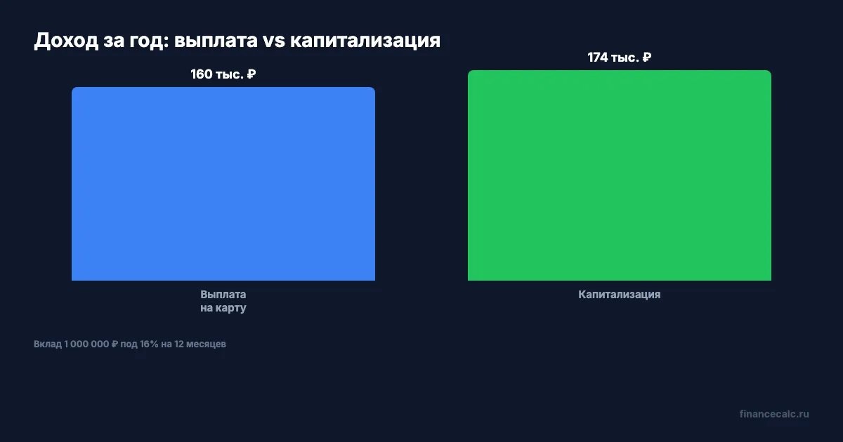 Вклад 1 000 000 рублей под 16% годовых приносит ~13 333 рубля каждый месяц на карту. Для пенсионера или фрилансера это ощутимая прибавка к доходу — сравнимая с частичной занятостью. Но есть нюанс: при капитализации тот же вклад за год принесёт на 13 858 рублей больше. Когда стоит выбирать ежемесячную выплату, а когда — капитализацию? Разбираемся с цифрами. Банк начисляет проценты на тело вклада раз в месяц и переводит их на отдельный счёт или карту. Тело вклада при этом не меняется — сегодня на счёте 1 000 000 рублей, и через полгода там по-прежнему 1 000 000 рублей. Ключевое отличие от капитализации: при капитализации проценты прибавляются к телу вклада, и следующий месяц начисление идёт уже на увеличенную сумму. Работает сложный процент. При ежемесячной выплате сложного процента нет — каждый месяц вы получаете одинаковую сумму. Проверить разницу можно в калькуляторе вкладов: введите сумму, ставку, срок — и сравните результат с капитализацией и без неё. Формула простая: сумма вклада ×