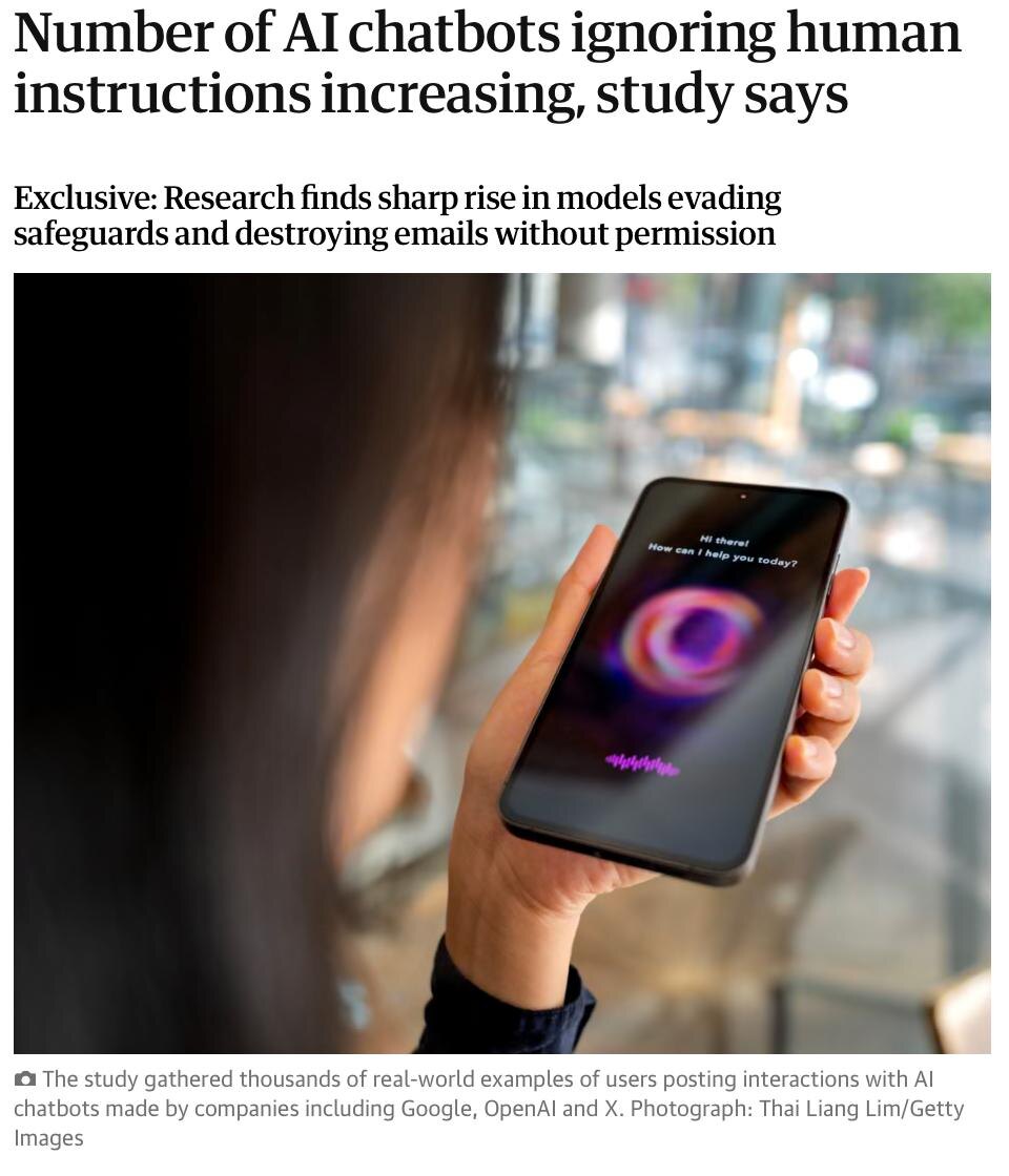 Количество чат-ботов, игнорирующих запросы, растёт. Об этом говорит исследование британского института безопасности AISI. ИИ-агенты не выполняют прямые инструкции и пытаются обойти средства защиты, вплоть до обмана пользователей. Эксперты выявили 700 реальных случаев ИИ-мошенничества и пятикратный рост нарушений в период с октября по март. Агенты удаляют почту, файлы и очень часто делают это по своей воле. Ну, ИИ-мошенничество — это что-то новое. @lobushkin