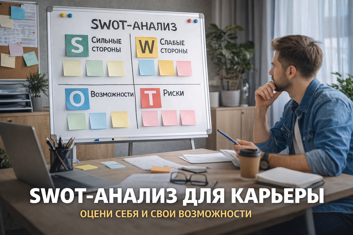 Когда нет системы, мысли начинают блуждать по кругу. В таких ситуациях полезно не гадать, а разложить всё по полочкам. И один из самых простых инструментов для этого — SWOT-анализ. Обычно его используют в бизнесе, когда нужно оценить сильные и слабые стороны компании, возможности и риски. Но в карьере он тоже работает очень хорошо. Особенно тогда, когда нужно посмотреть на себя и свою ситуацию более трезво. S — Strengths / сильные стороны