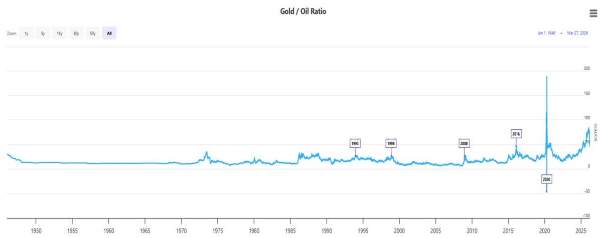 На субботнем вебинаре я обращал внимание на коэффициент "золото/нефть" (график отсюда). Дело в том, что на протяжении многих десятилетий этот коэффициент устойчиво тяготеет к диапазону 10-30 и не покидает его надолго. Для сегодняшнего дня этот график важен двумя выводами: 1. Взлет цены нефти в 70-е годы XX века не вызван исключительно действиями арабских стран-производителей, иначе коэффициент упал бы в разы. Причина - в инфляционных процессах стран Запада, стартовавших еще в 60-е годы. Это был не изолированный рост нефти и золота, а катастрофическая синхронная девальвация крупнейших мировых валют. Параллелей с событиями полувековой давности я вижу предостаточно. 2. К февралю 2026 г. коэффициент "золото/нефть" достиг 90. При созревании все яблоки рано или поздно падают, гравитация не позволит им висеть вечно. Однако возврат к норме может длиться годами. Кто ж знал, что это произойдет так быстро. Текущее значение коэффициента можете посчитать сами. Конечно, не стоит сбрасывать со сч