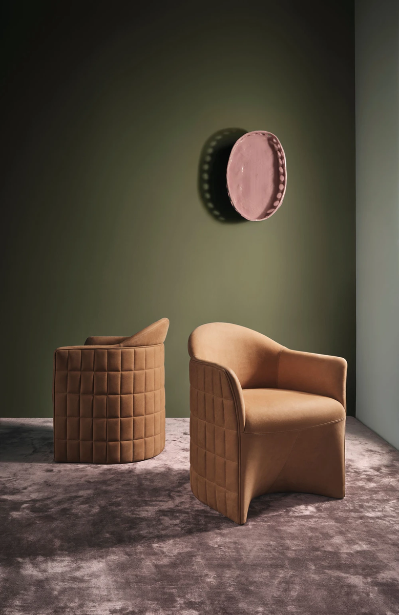 Главные особенности: стёганая кожаная обивка (ромбовидный паттерн, ручная работа, высший пилотаж мастерства), контраст материалов (гладкая кожа снаружи, фактурная ткань внутри), округлая спинка (отсылка к креслу Barrel Хоффмана), гибридный формат (комфортно и за столом, и в кабинете, и в гостиной), ручная работа (каждое кресло с подписью мастера).