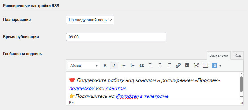 У моего плагина для WordPress «Продзен — Интеграция с Дзеном» появилось премиальное дополнение — плагин «Продзен Плюс». Процесс выпуска нового плагина немного затянулся, причём не столько из-за сложностей разработки, сколько из-за организационных вопросов. Мне пришлось реализовать как систему продаж плагина, так и систему обновления. Теперь я готов представить этот плагин вашему вниманию. «Продзен Плюс» добавляет к каждому модулю, который есть в базовом плагине, дополнительные возможности. Также есть два новых модуля, которые могут показаться особенно полезными. Это модуль создаёт полноценную RSS-ленту для импорта публикаций в Дзен. С плагином «Продзен Плюс» в нём будут доступны новые возможности: Здесь можно настроить то время, когда статья, импортированная с сайта, будет публиковаться в Дзене. По умолчанию статьи публикуются сразу, но можно настроить задержку (допустим, через час после выхода на сайте) или указать, чтобы публикация в Дзене происходила на следующий день в заданное вре