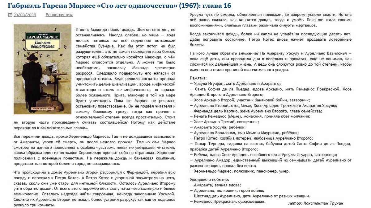 Габриэль Гарсиа Маркес «Сто лет одиночества» (1967): глава 16 | Критика