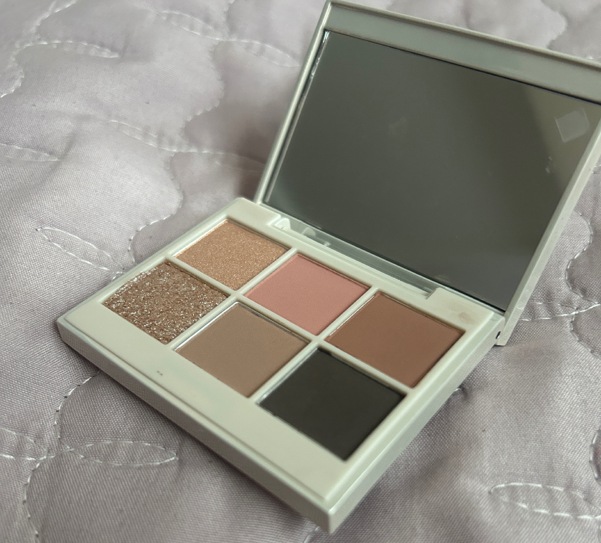Палетка малюсенькая, размером с ладонь, с очень качественным пластиком молочного оттенка. Крышка на магните, по краям небольшие выступы, чтобы не ломать ногти, добираясь до содержимого.